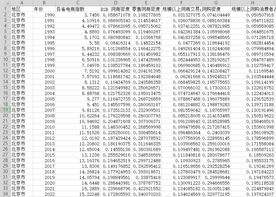 中国各省的电子商务指数数据,基于阿里研究院的阿里巴巴平台海量数据,涵盖网商指数与网购指数两个方面,综合直观地反映了各省电子商务发展水平,采用熵值法进行测算。具体而言: