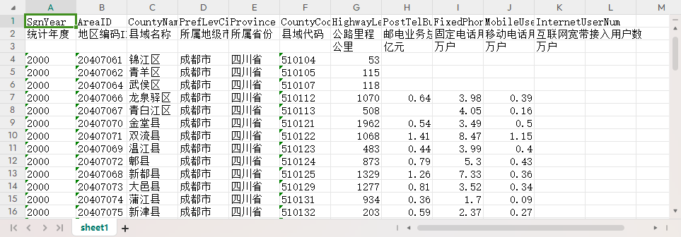 统计年度 地区编码ID 县域名称 所属地级市 所属省份 县域代码 公路里程 邮电业务总量 固定电话用户数 移动电话用户数 互联网宽带接入用户数