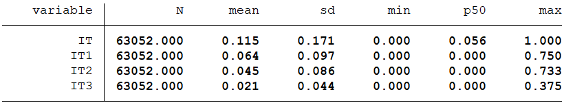 (4)IT3:监事的信息技术背景,用上市公司拥有信息技术背景监事的比例来衡量,等于上市公司当年具有信息技术背景的监事数量除以监事总人数