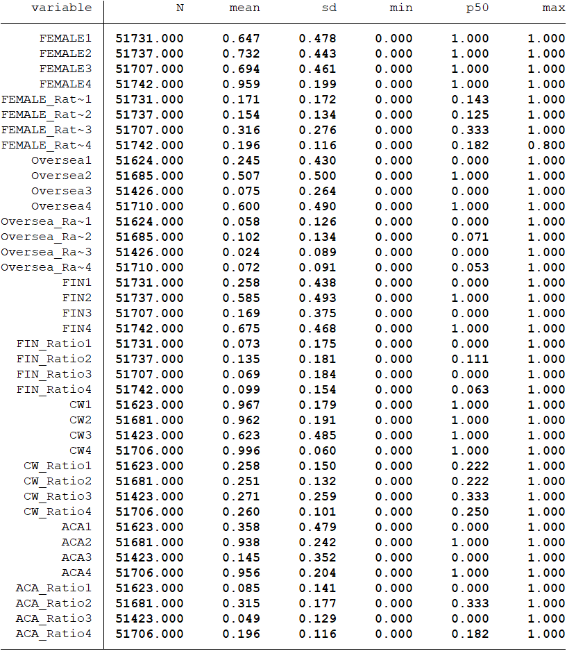 女性董监高虚拟变量FEMALE4:若企业在当年至少有一个女性董监高则取值为1,否则为0