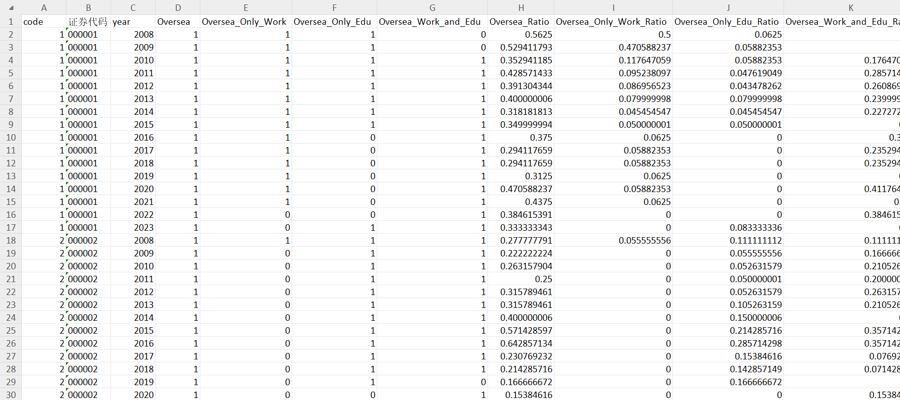 海外学习及工作经历高管占比Oversea Work and Edu Ratio:同时具有海外学习和工作经历的高管人数除以高管人数