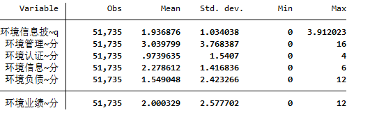 由环境管理披露、环境认证披露、环境信息披露载体、环境负债披露、环境业绩与治理披露五个方面共 25 个指标构成,对于非货币化的信息,如果其中一项披露则为 2,否则为 0;对于货币化的信息,定量和定性描述为 2,仅定性描述为 1,不描述为 0。将 25 项指标加总并作对数处理得到此变量