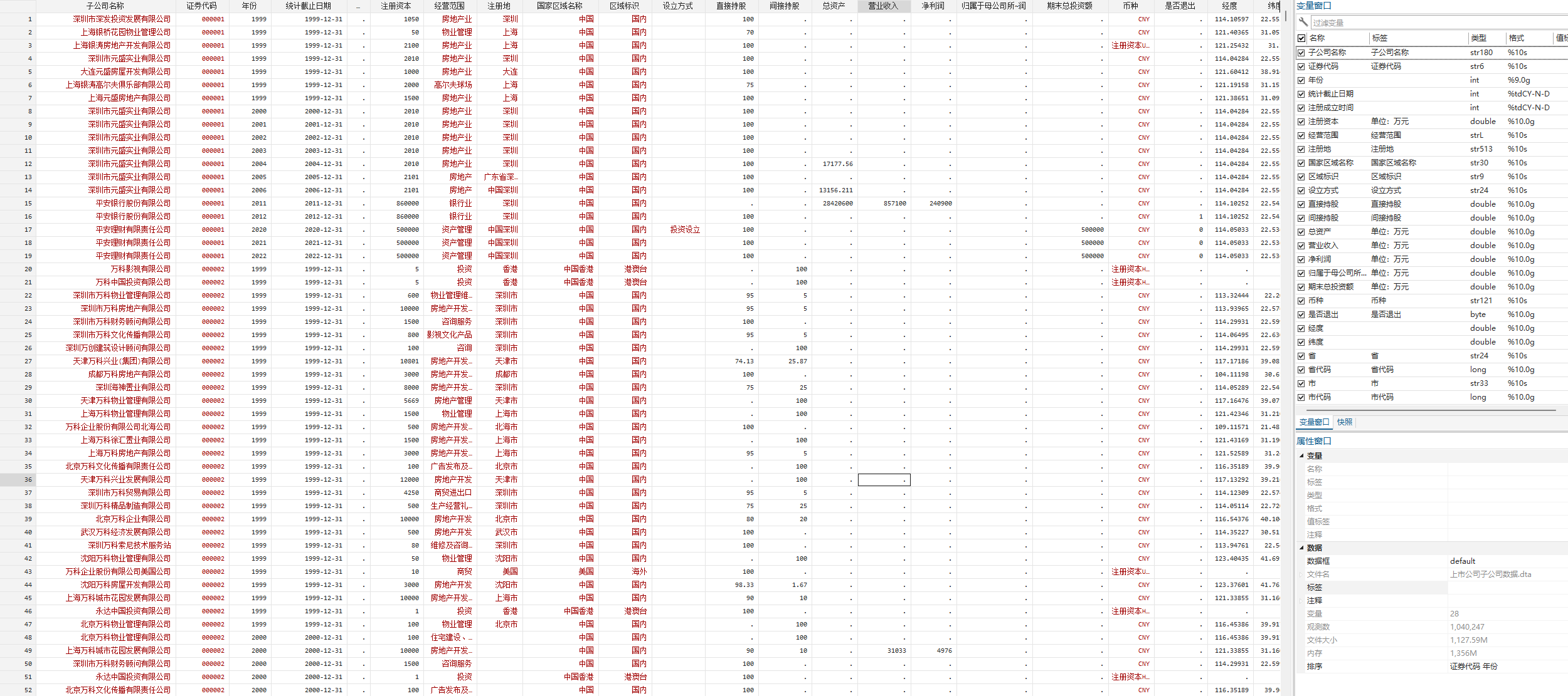 子公司名称、证券代码、年份、统计截止日期、注册成立时间、注册资本、经营范围、注册地、国家区域名称、区域标识、设立方式、直接持股、间接持股、总资产、营业收入、净利润、归属于母公司所有者的净利润、期末总投资额、币种、是否退出、经度、纬度、省、省代码、市、市代码、县、县代码。