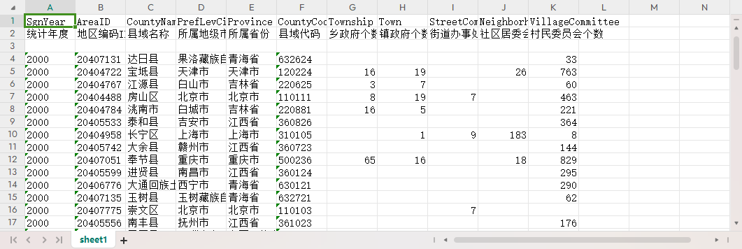 统计年度 地区编码ID 县域名称 所属地级市 所属省份 县域代码 乡政府个数 镇政府个数 街道办事处个数 社区居委会个数 村民委员会个数