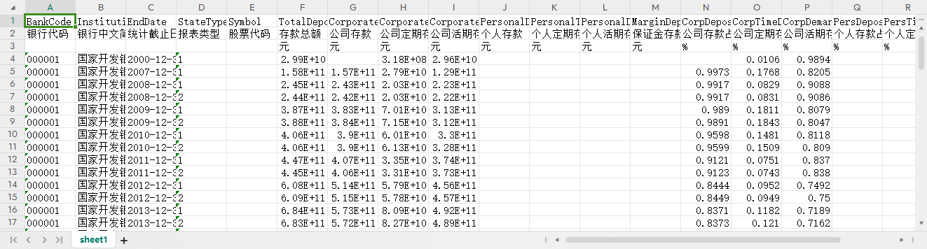 银行代码 银行中文简称 统计截止日期 报表类型 股票代码 存款总额 公司存款 公司定期存款 公司活期存款 个人存款 个人定期存款 个人活期存款 保证金存款 公司存款占比 公司定期存款占比 公司活期存款占比 个人存款占比 个人定期存款占比 个人活期存款占比 保证金存款占比
