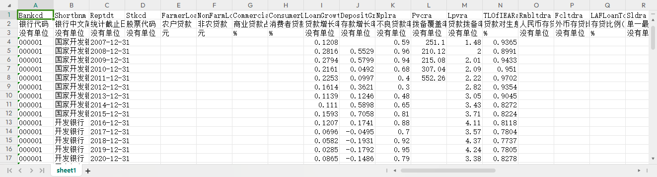 银行代码 银行中文简称 统计截止日期 股票代码 农户贷款 非农贷款 商业贷款占总贷款比例 消费者贷款占总贷款比例 贷款增长率(%) 存款增长率(%) 不良贷款率(%) 拨备覆盖率(%) 贷款拨备率(%) 贷款对生息资产比率 人民币存贷比例(%) 外币存贷比例(%) 存贷比例(本外币) 单一最大客户贷款比率(%) 最大十家客户贷款 最大十家客户贷款比率(%) 拆入资金比例(%) 拆出资金比例(%) 国际商业借款比例(%) 利息回收率(%) 正常贷款迁徙率(%) 关注类贷款迁徙率(%) 次级类贷款迁徙率(%) 可疑类贷款迁徙率(%) 正常贷款 关注贷款 次级贷款 可疑贷款 损失贷款 逾期贷款 贷款损失准备充足率(%) 贷款呆账准备年初值 贷款呆账准备本年提取 已减值贷款利息冲减 本年收回的贷款呆账 本年转出的贷款呆账 本年核销的贷款呆账 贷款呆账准备年末值