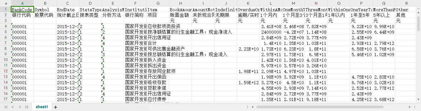 银行代码 股票代码 统计截止日期 报表类型 分析方法 银行简称 项目 账面金额 未折现合同现金流入/流出 无期限 逾期/实时偿还 1个月内 1个月至3个月 3个月至1年 1年以内 1年至5年 5年以上 其他