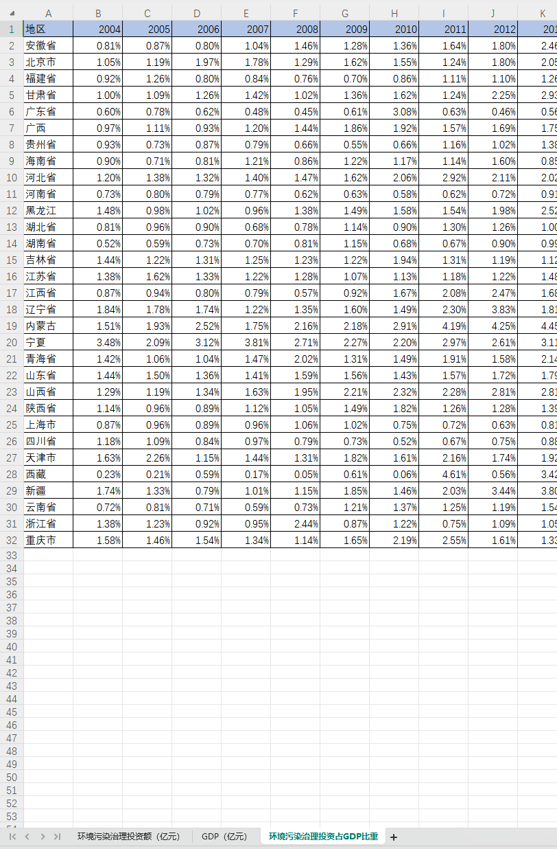 数据整理全国各个省环境污染治理投资额数据,以及整理各个省的地区生产总值GDP与环境污染治理投资额之比。