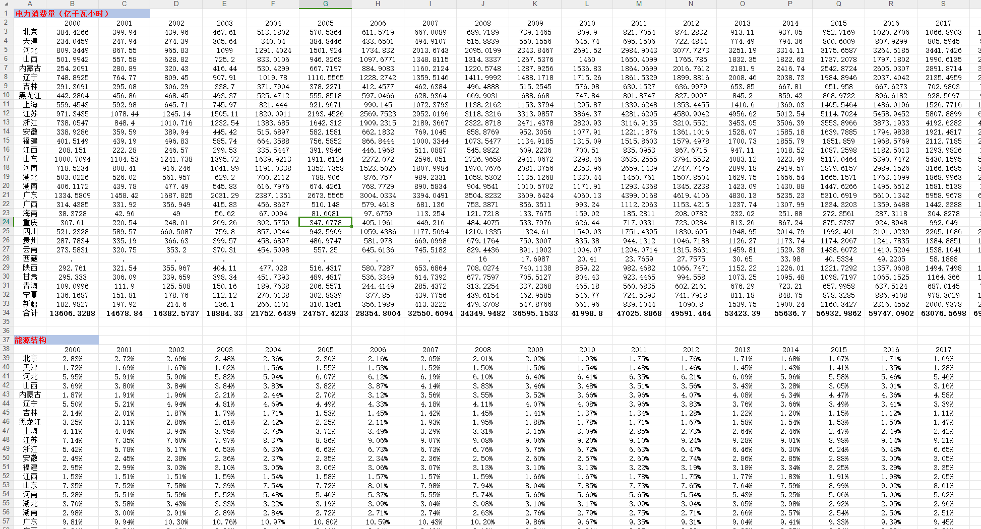 - 能源结构(电力消费水平)=地区电力消费量/全国电力消费总量