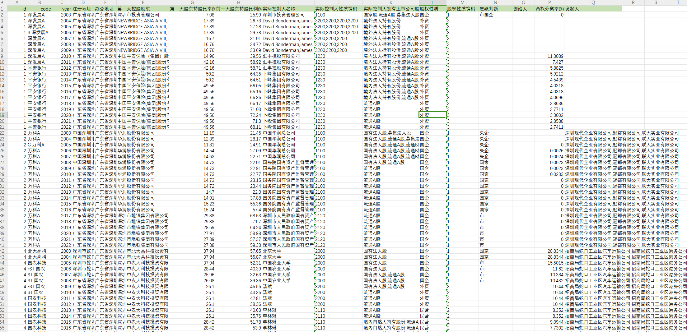 id、code、year、注册地址、办公地址、第一大控股股东、第一大股东持股比率(%)、前十大股东持股比例(%)、实际控制人名称、实际控制人性质编码、实际控制人拥有上市公司股份性质、股权性质、股权性质编码、层级判断、创始人、两权分离率(%)、发起人。