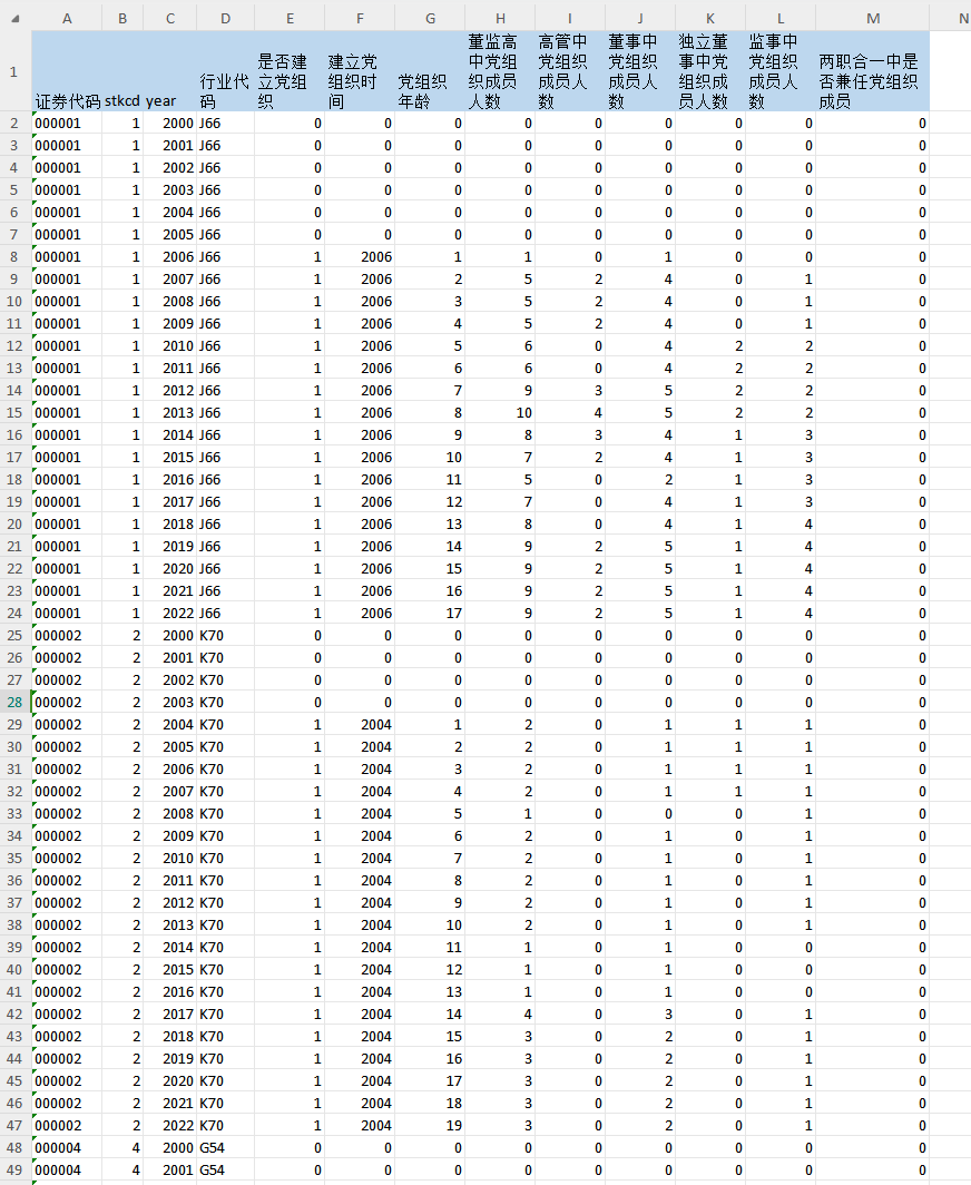 证券代码、stkcd、year、行业代码、是否建立党组织、建立党组织时间、党组织年龄、董监高中党组织成员人数、高管中党组织成员人数、董事中党组织成员人数、独立董事中党组织成员人数、监事中党组织成员人数、两职合一中是否兼任党组织成员