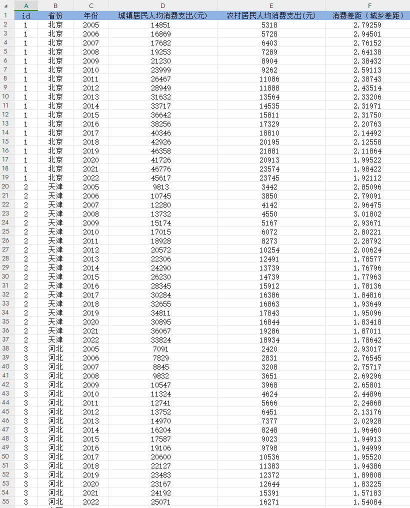 id、省份、年份、城镇居民人均消费支出(元)、农村居民人均消费支出(元)、消费差距(城乡差距)