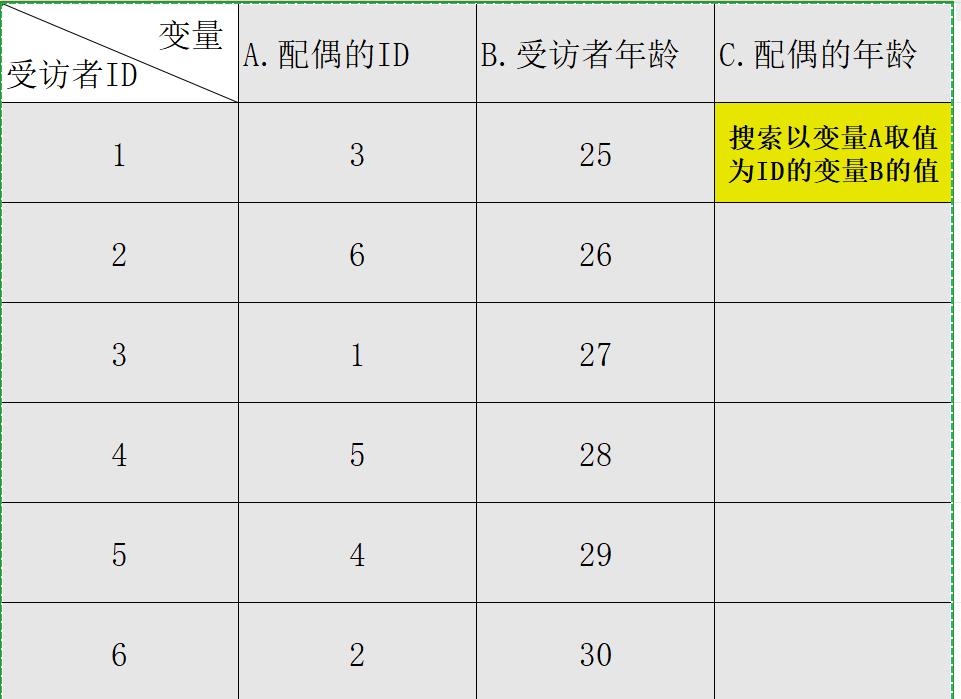 如图所示,假设有受访者ID为1,2,3,4,5,6。其中两两配对为夫妻。现在我们知道每个人的年龄,如何添加一个新变量,以显示配偶的年龄?