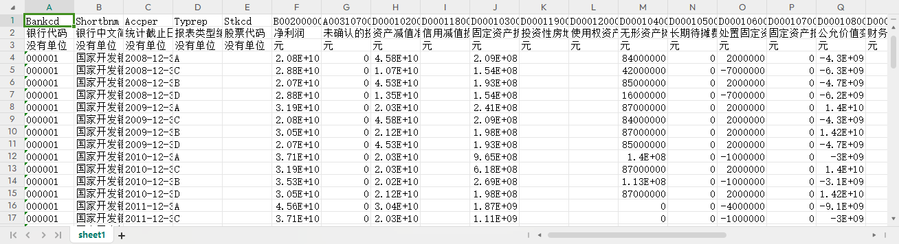 银行代码 银行中文简称 统计截止日期 报表类型编码 股票代码 净利润 未确认的投资损失 资产减值准备 信用减值损失 固定资产折旧 投资性房地产折旧及摊销 使用权资产折旧及摊销 无形资产摊销 长期待摊费用摊销 处置固定资产、无形资产和其他长期资产的损失(收益以“-”号填列) 固定资产报废损失(收益以“-”号填列) 公允价值变动损失(收益以“-”号填列) 财务费用(收益以“-”号填列) 投资损失(收益以“-”号填列) 递延所得税资产减少(增加以“-”号填列) 递延所得税负债增加(减少以“-”号填列) 经营性应收项目的减少(增加以“-”号填列) 经营性应付项目的增加(减少以“-”号填列) 其他 经营活动产生的现金流量净额 现金的期末余额 现金的期初余额 现金等价物的期末余额 现金等价物的期初余额 现金及现金等价物净增加额