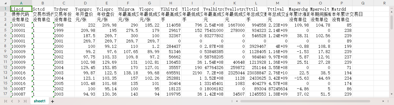 债券代码 交易市场代码 交易年份 年开盘价 年收盘价 年最高成交价 年最低成交价 年最高成交数量 年最低成交数量 年最高成交金额 年最低成交金额 年总成交数量 年总成交金额 年累计涨跌幅 年期间振幅 本年累计交易日