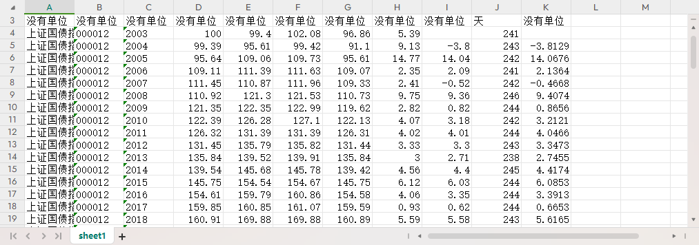 全国债券市场债券指数年文件表2002-2024年初开盘指数年末收盘指数年指数最高值年指数最低年期间振幅年累计涨跌幅累积交易日年指数回报率