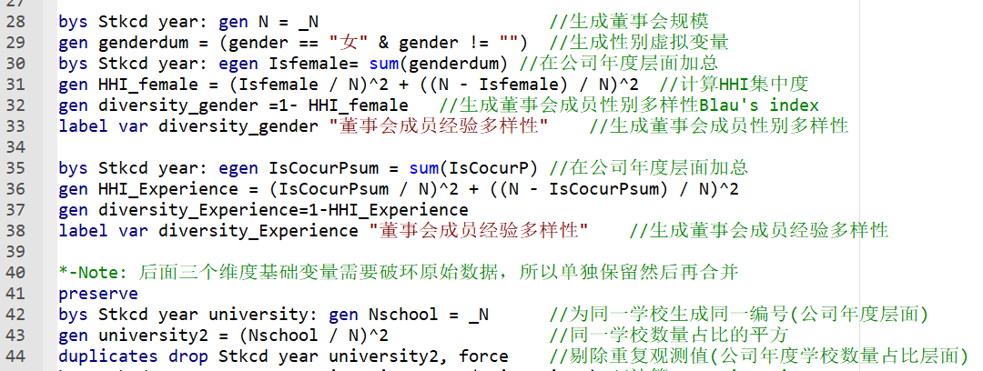 2.测算方式:董事会多样性分为统计学层面的多样性和认知层面的多样性。董事会多样性可分为五个方面,分别是董事会成员年龄、性别、经验、教育背景和专业的多样性。具体度量方式如下: (1)董事会成员年龄多样性(Age):董事会成员的年龄差异。使用董事会成员年龄变异系数进行度量,变异系数越大说明董事会成员年龄多样性较高; (2)董事会成员性别多样性(Gender):是董事会成员的性别丰富度。使用董事成员是否为女性作为类别变量, 性别为女赋值为 1, 否则2, 然后用BLAU指数来衡量,该指标越高,说明该公司董事会成员在该维度越分散,较高则说明董事会成员多样性更高(3)董事会成员经验多样性(Experience):董事会成员经验的丰富程度。使用董事成员是否在股东单位任职作为类别变量, 兼任为类别 1, 不兼任为类别 2, 然后 BLAU指数来衡量,该指标越低,说明该公司董事会成员集中于一个类别,较高则说明董事会成员多样性更高; (4)董事成员教育背景多样性(University):董事会成员教育经历的丰富程度。使用董事 会成员的毕业院校来代表教育背景。 根据授予每个董事会成员学士学位的机构, 计算 diversity_University,该指标越高,董事会成员教育经历丰富程度越高; (5)董事会成员专业多样性(Major):董事会成员所学专业的多样性。将所有的专业分为 五个方面:经济/金融、管理、财会、法律、其他,依次赋值为 1、2、3、4、5,如果专业为 缺失值,则赋值 6,然后计算 diversity_University,该指标越高,董事会成员专业丰富程度越高。