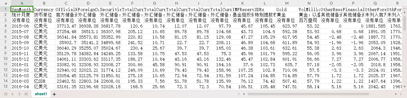 统计月度 货币单位 官方储备资产 外汇储备 外汇储备:证券 外汇储备:货币和存款总额 外汇储备:货币和存款总额A 外汇储备:货币和存款总额B 外汇储备:货币和存款总额B01 外汇储备:货币和存款总额C 基金组织储备头寸 特别提款权 黄金 黄金:以盎司计算的纯金数量 其他储备资产 其他储备资产:金融衍生产品 未列入官方储备的外币资产 未列入官方储备的外币资产:证券 未列入官方储备的外币资产:贷款 未列入官方储备的外币资产:金融衍生工具