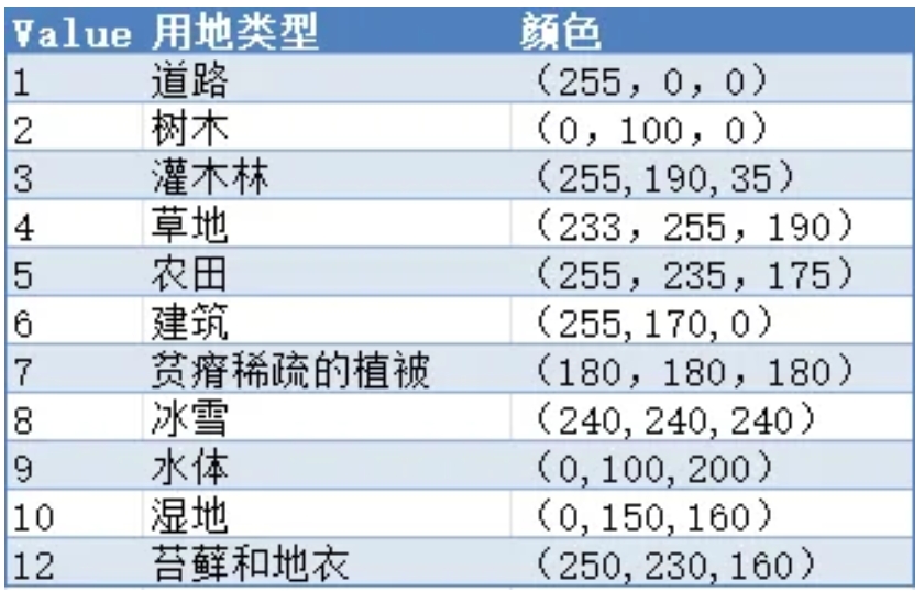 分为九类用地,以数字的形式表示,数字对应的用地类型为: