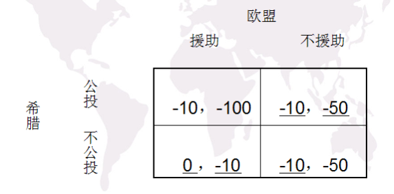 3、希腊不公投,欧盟援助。希腊同意降低福利,紧缩财政政策等条件,接受援助,债务危机得到暂时缓解,支付为0;欧盟为其提供援助,需要提供一定资金支持,支付为-10.