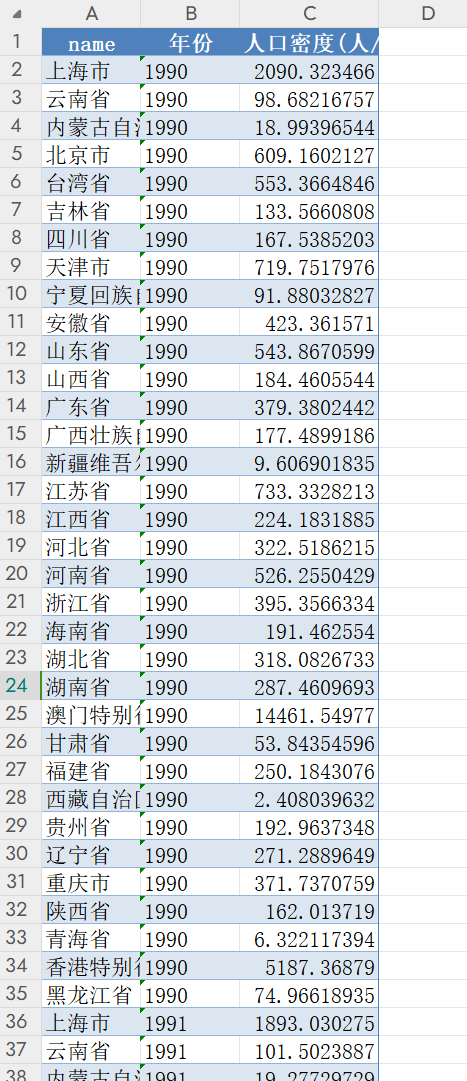 原始数据为长时序的全国人口与人口密度的栅格数据,但考虑到栅格数据使用起来对大家并不方便,将其整理成省市县的面板数据,其中包含各省市县的人口数量与人口密度(人/平方公里)