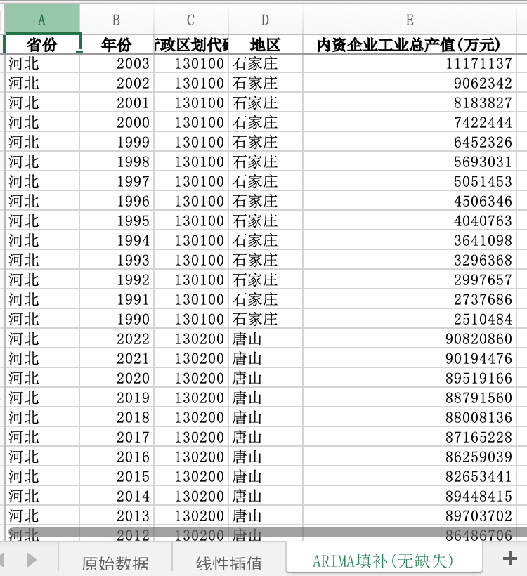 数据格式:Excel数据文件包含原始数据(由于多年度指标不同存在缺失值)、线性插值、ARIMA填补(无缺失)三个版本,提供您参考使用。其中,ARIMA填补无缺失值。
