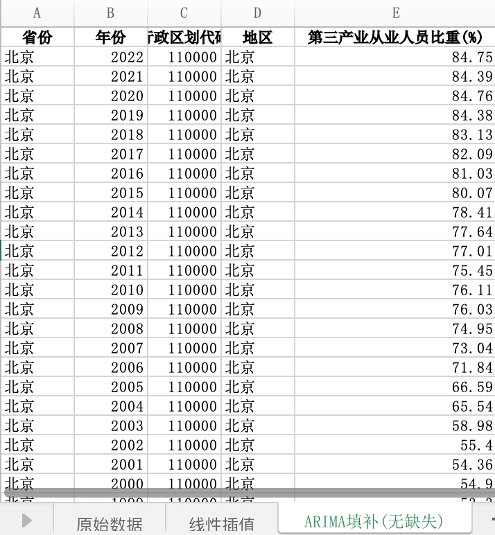 数据格式:Excel数据文件包含原始数据(由于多年度指标不同存在缺失值)、线性插值、ARIMA填补(无缺失)三个版本,提供您参考使用。其中,ARIMA填补无缺失值。