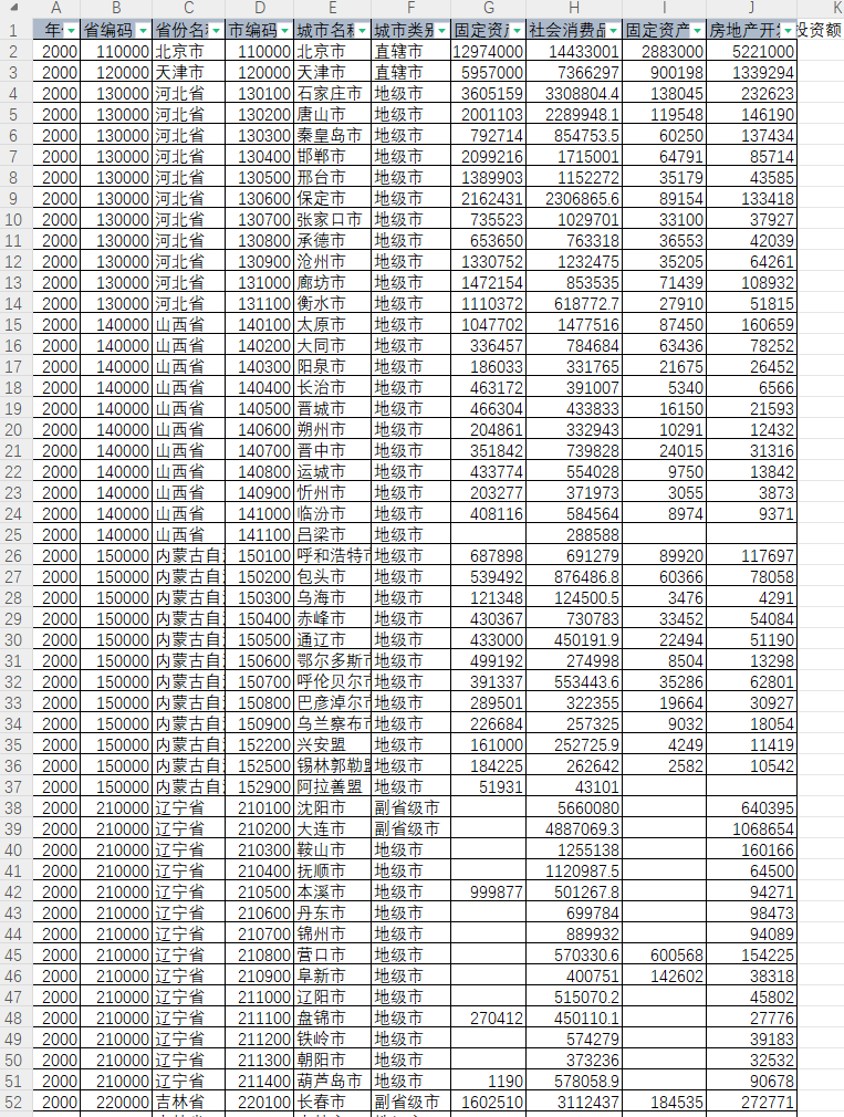 年份、省编码、省份名称、市编码、城市名称、城市类别、固定资产投资总额、社会消费品零售总额、固定资产投资中住宅投资、房地产开发投资额。