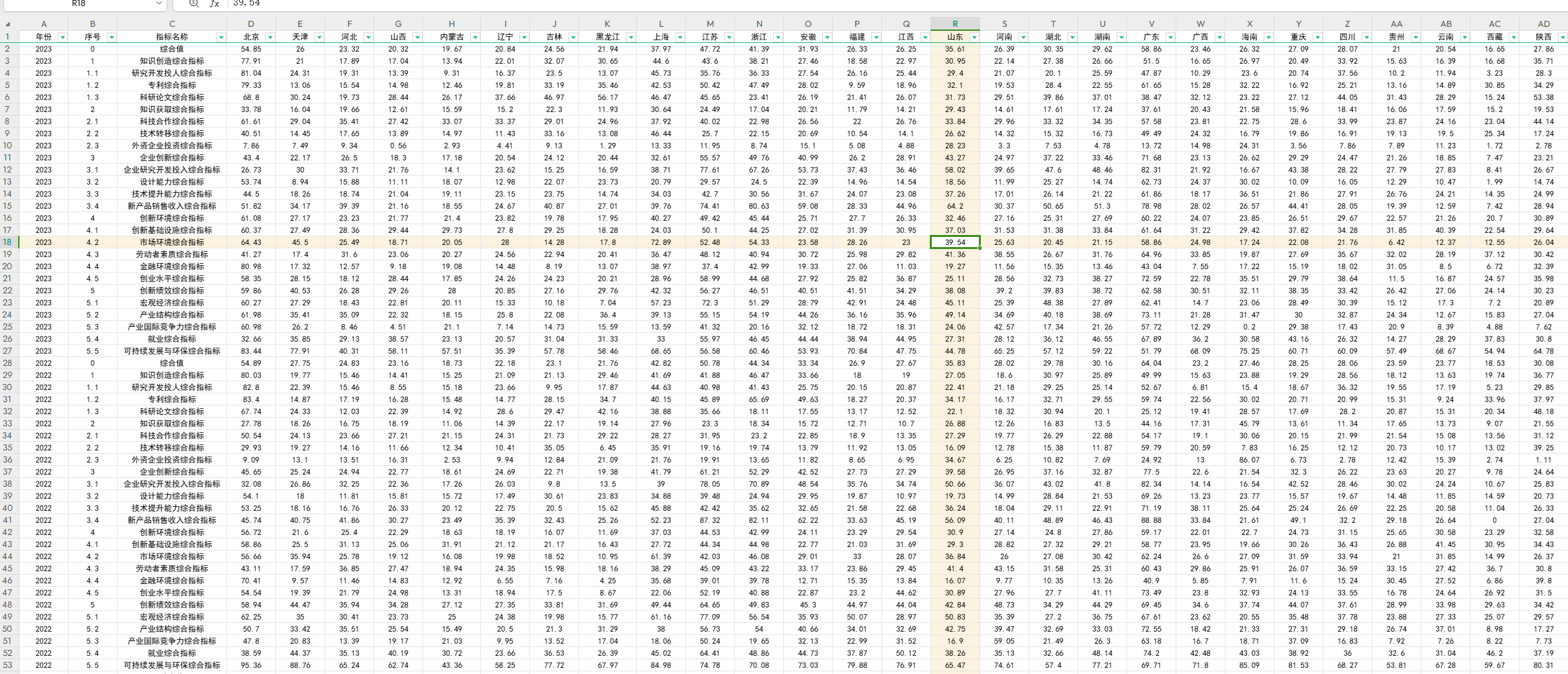 - 两个版本:区域创新能力细分指标2003-2023年、区域创新能力总指标值2003-2023年。(2003-2006 年二级指标共 21 个,2007-2023 年二级指标共 20 个,两者差异为2003-2006 年数据含1.4 投入产出比综合指标,而 2007-2023年二级指标不含1.4 投入产出比综合指标)