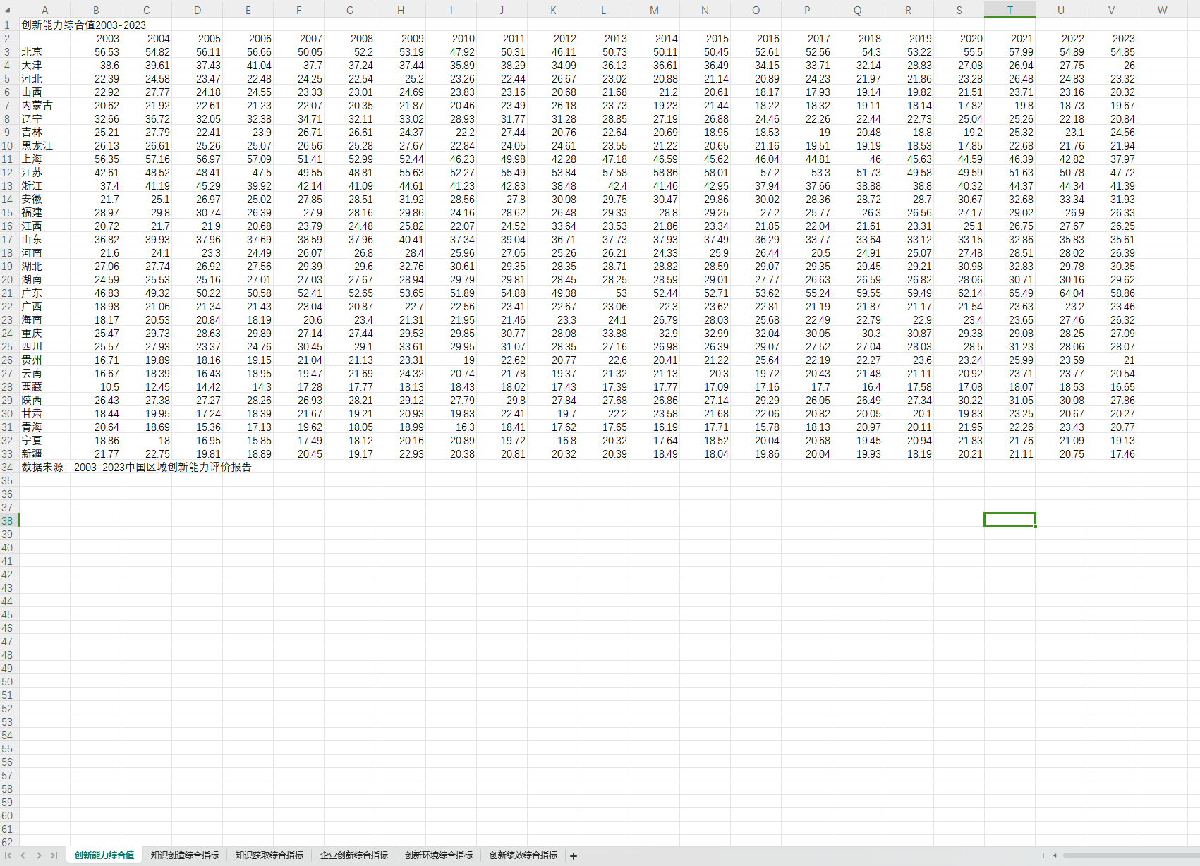 【创新能力综合值】创新能力综合值=知识创造综合指标×0.15+知识获取综合指标×0.15+企业创新综合指标×0.25+创新环境综合指标×0.25+创新绩效综合指标×0.2,以上指标的原始数据均从《中国区域创新能力评价报告》中提取整理未经二次处理。
