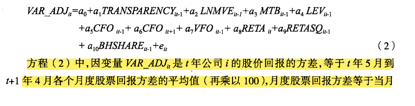 - VAR-ADJ是t年公司i的股价回报的方差,等于t年5月到t+1年4月各个月度股票回报方差的平均值(再乘以100),月度股票回报方差等于当月日个股回报(市场调整后)的方差乘以当月交易天数