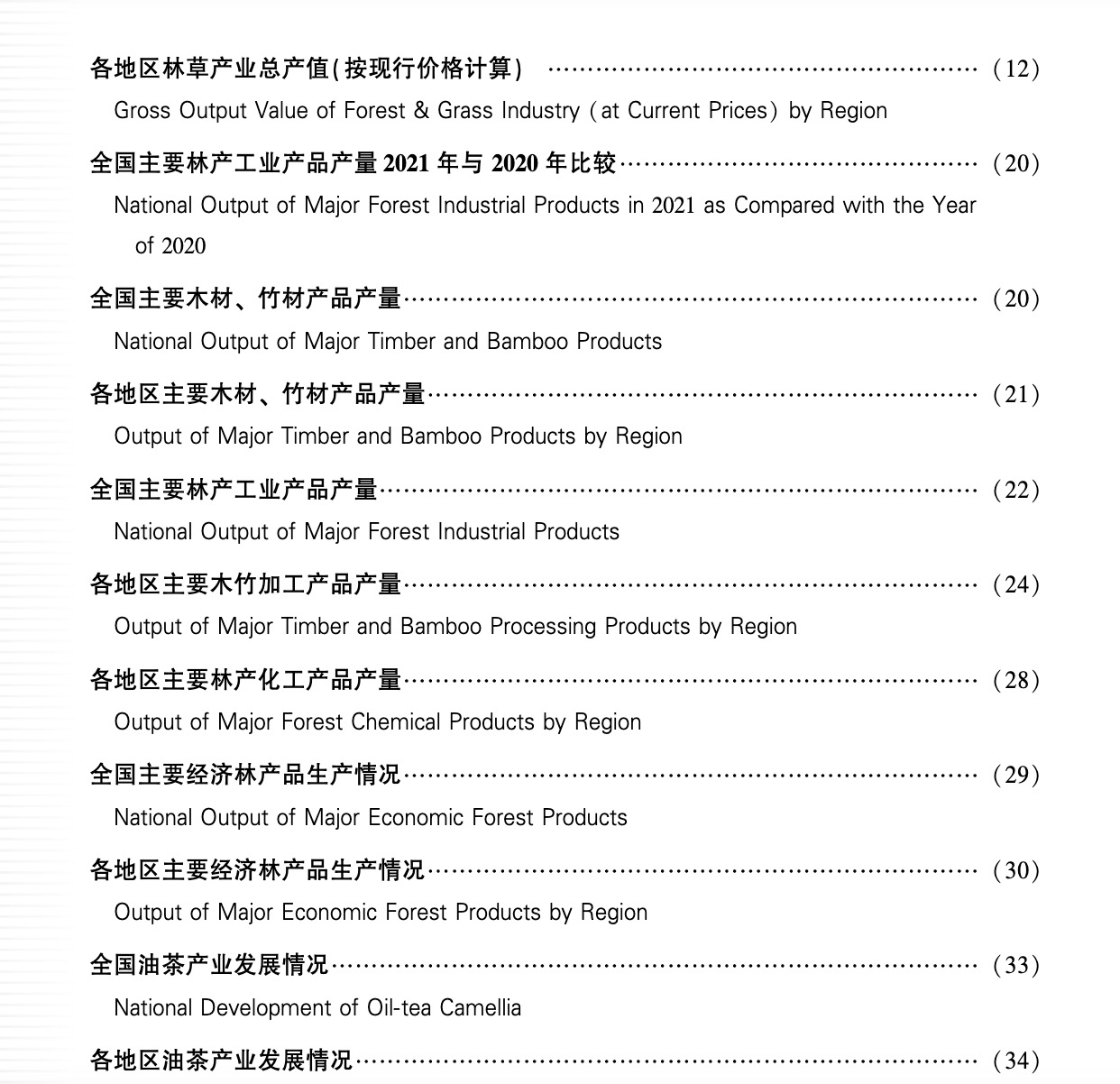 二、本书系根据各省、自治区、直辖市林业草原管理部门以及国家林业和草原局相关司局、直属单位上报的 2021 年林业草原统计年报和其他有关资料编辑而成。全书分为:国土绿化、产业发展、从业人员和劳动报酬、林草投资、林草教育5 个部分及东北、内蒙古重点国有林区森工企业主要统计指标、林业工作站和乡村林场基本情况、林草主要灾害情况、全国分县造林情况、全国历年主要统计指标完成情况、主要林草产品进出口情况、野生动植物进出口情况和世界主要国家林业情况8 个附录。