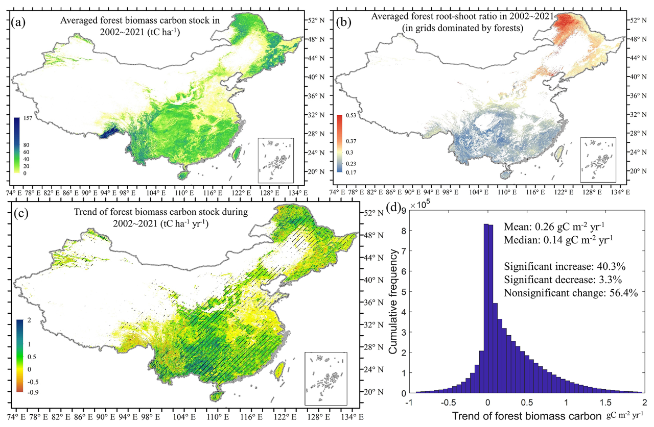 参考文献:Chen, Y., Feng, X., Fu, B. (2023). Above- and belowground forest biomass carbon pool in China during 2002~2021. National Tibetan Plateau / Third Pole Environment Data Center. https://doi.org/10.5194/essd-15-897-2023.