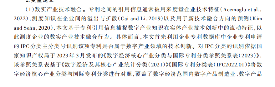 参考黄先海和高亚兴(2023)的方法,首先利用企业专利数据库中企业专利申请的IPC分类主分类号识别该项专利是否属于数字产业领域的技术创新。对IPC分类的识别依据国家知识产权局于2023年3月发布的《数字经济核心产业分类与国际专利分类参照关系表(2023)》,该参照关系表基于《数字经济及其核心产业统计分类(2021)》《国际专利分类表(IPC2022.01)》将数字经济核心产业分类与国际专利分类进行对照,覆盖了数字经济范围内数字产品制造业、数字产品服务业、数字技术应用业和数字要素驱动业等四类核心产业,建立起与国际专利分类表中大类、小类、大组、小组等层面的对照关系。将此参照关系表与专利数据库匹配,从而识别每项发明专利是否为数字产业技术。进一步地,利用专利公开号将专利引用信息与其他专利信息进行匹配,识别该项专利所引用的专利是否分类为数字产业技术。结合理论分析,对数实产业技术融合变量做如下定义:若该项专利IPC主分类属于非数字产业技术,且其引用的专利中至少有一项专利分类为数字产业技术,则定义该项专利为企业的一次数实产业技术融合行为。基于此定义,将该指标加总到企业—年份层面得到企业各年度数实产业技术融合数量,加1取自然对数后作为企业数实产业技术融合的衡量指标。