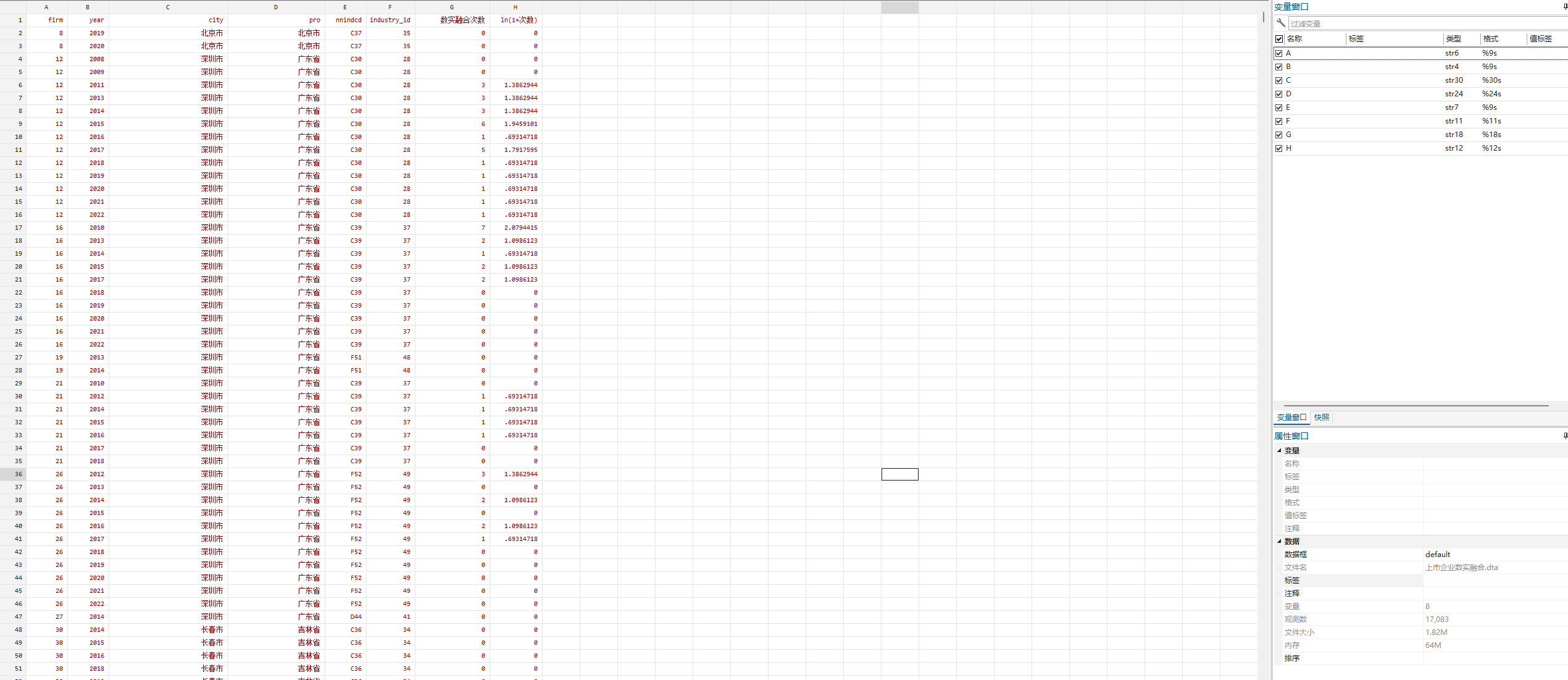指标体系:firm、年份、省份、城市、nnindcd、industry_id、数实融合次数 ln(1+次数)。