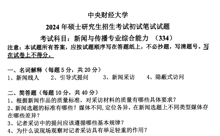 中财中央财经大学334新闻与传播专业综合能力2024(无答案)