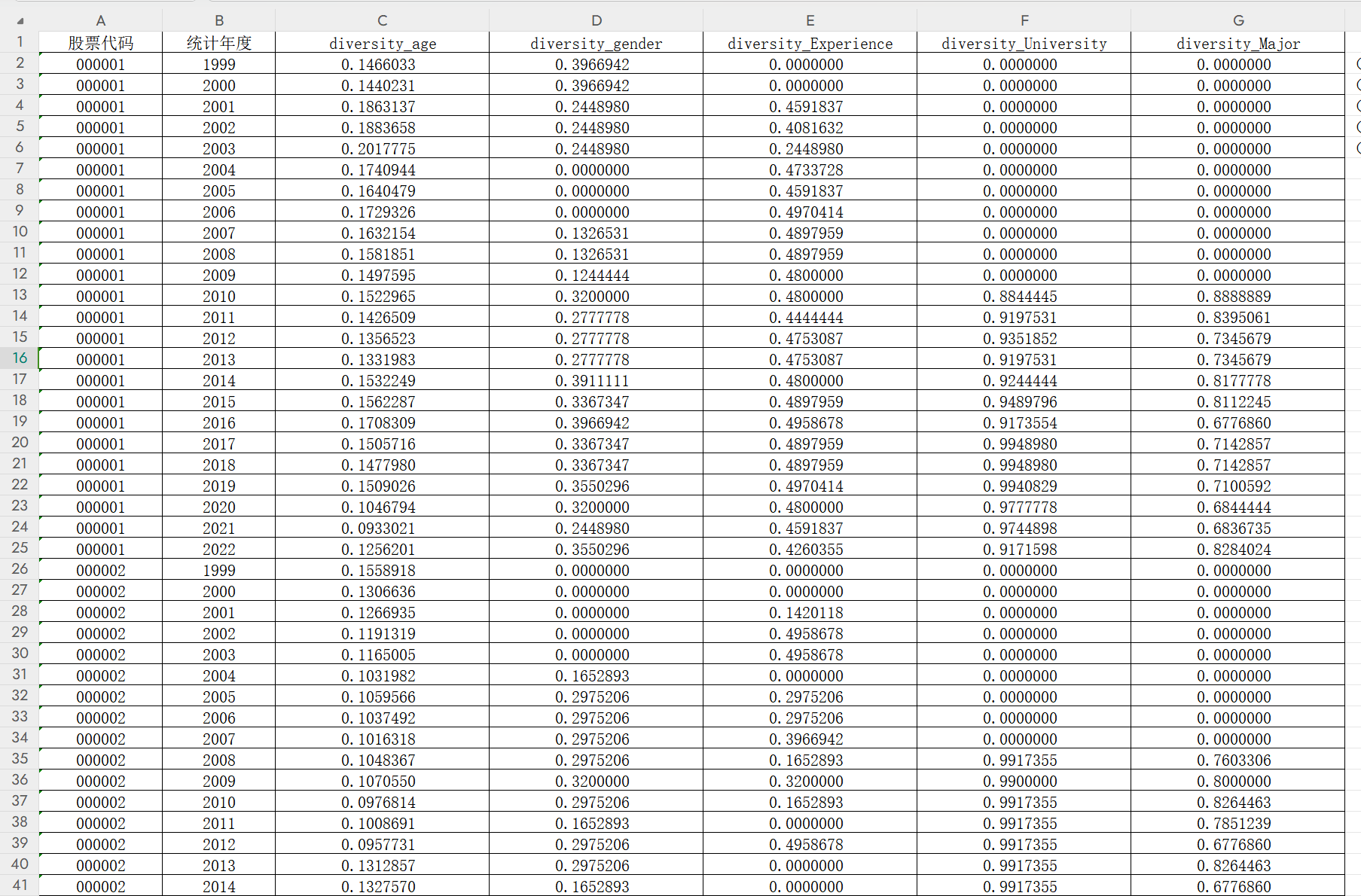 (4)董事成员教育背景多样性(University):董事会成员教育经历的丰富程度。使用董事 会成员的毕业院校来代表教育背景。 根据授予每个董事会成员学士学位的机构, 计算 diversity_University,该指标越高,董事会成员教育经历丰富程度越高。