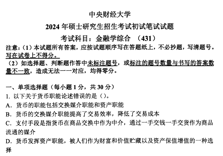 中财中央财经大学431金融学综合2024(无答案).png