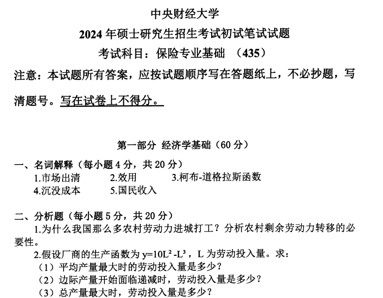 中财中央财经大学435保险专业基础2024(无答案).pdf