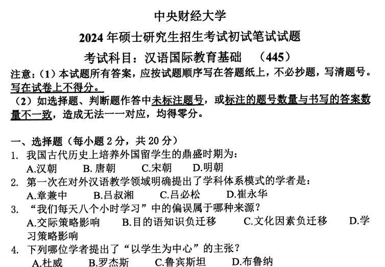 中财中央财经大学445汉语国际教育基础2024(无答案)