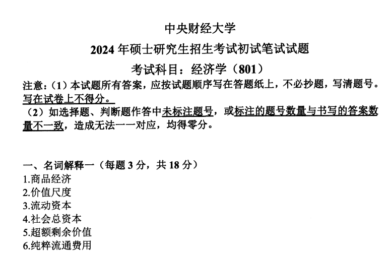 中财中央财经大学801经济学2024(无答案)
