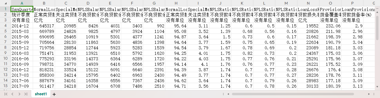 统计季度 正常类贷款 关注类贷款 不良贷款余额 不良贷款余额:次级贷款 不良贷款余额:可疑贷款 不良贷款余额:损失贷款 正常类贷款占比(%) 关注类贷款占比(%) 不良贷款率(%) 不良贷款率:次级贷款(%) 不良贷款率:可疑贷款(%) 不良贷款率:损失贷款(%) 贷款损失准备 拨备覆盖率(%) 贷款拨备率(%)