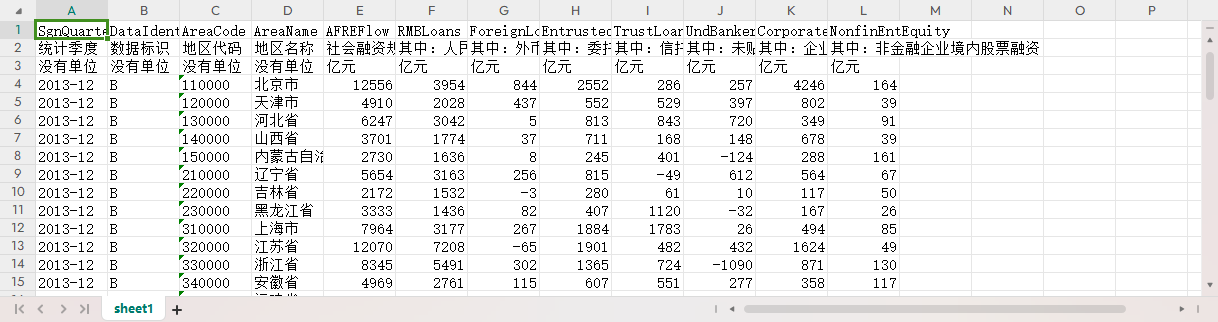 统计季度 数据标识 地区代码 地区名称 社会融资规模增量 其中:人民币贷款 其中:外币贷款(折合人民币) 其中:委托贷款 其中:信托贷款 其中:未贴现银行承兑汇票 其中:企业债券 其中:非金融企业境内股票融资