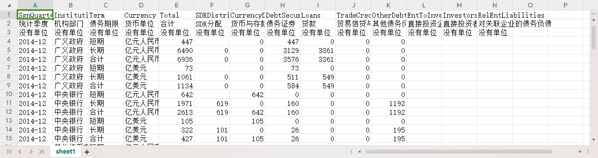 统计季度 机构部门 债务期限 货币单位 合计 SDR分配 货币与存款 债务证券 贷款 贸易信贷与预付款 其他债务负债 直接投资企业对直接投资者的债务负债 直接投资者对直接投资企业的债务负债 对关联企业的债务负债