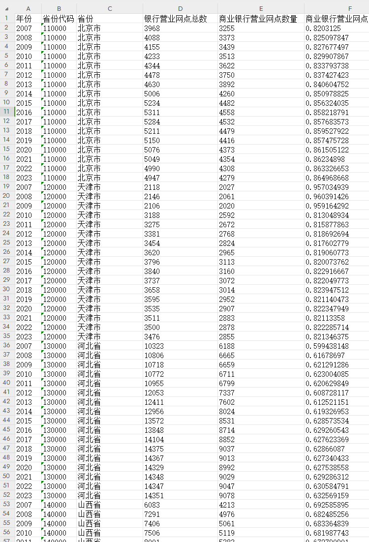 31个省市银行营业网点结构数据完整,每年各省无缺失,共527条数据