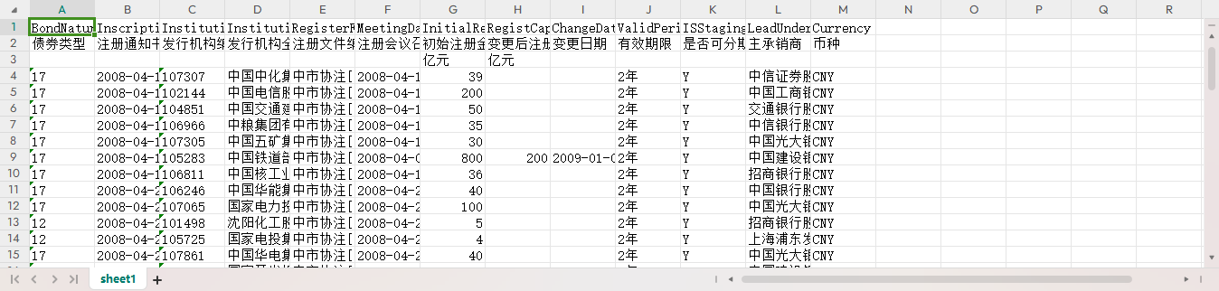 债券类型 注册通知书落款日期 发行机构编码 发行机构全称 注册文件编号 注册会议召开日期 初始注册金额 变更后注册金额 变更日期 有效期限 是否可分期 主承销商 币种