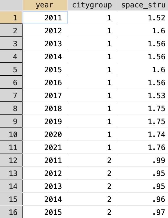 citygroup=1就是第一个城市群,1.京津冀城市群2.长三角城市群3.珠三角城市群4.成渝城市群5.长江中游城市群6.山东半岛城市群7.粤闽浙沿海城市群8.中原城市群9.关中平原城市群10.北部湾城市群11.哈长城市群12.辽中南城市群13.山西中部城市群14.黔中城市群15.滇中城市群16.呼包鄂榆城市群17.兰西城市群18.宁夏沿黄城市群19.天山北坡城市群参考:杨宏昌, 戴宏伟. “中心开花”需时日:空间结构对区域经济发展的影响——以我国19个城市群为例