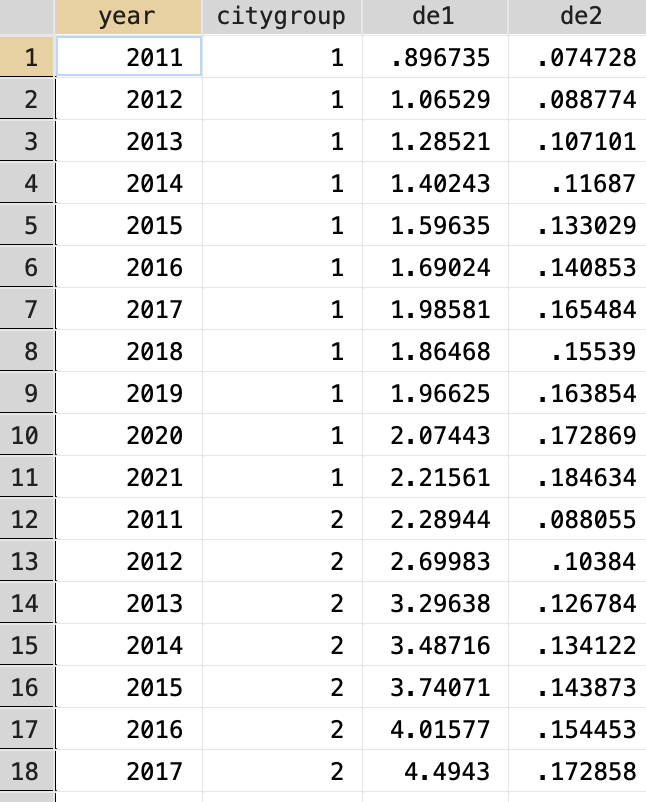 citygroup=1就是第一个城市群,1.京津冀城市群2.长三角城市群3.珠三角城市群4.成渝城市群5.长江中游城市群6.山东半岛城市群7.粤闽浙沿海城市群8.中原城市群9.关中平原城市群10.北部湾城市群11.哈长城市群12.辽中南城市群13.山西中部城市群14.黔中城市群15.滇中城市群16.呼包鄂榆城市群17.兰西城市群18.宁夏沿黄城市群19.天山北坡城市群
