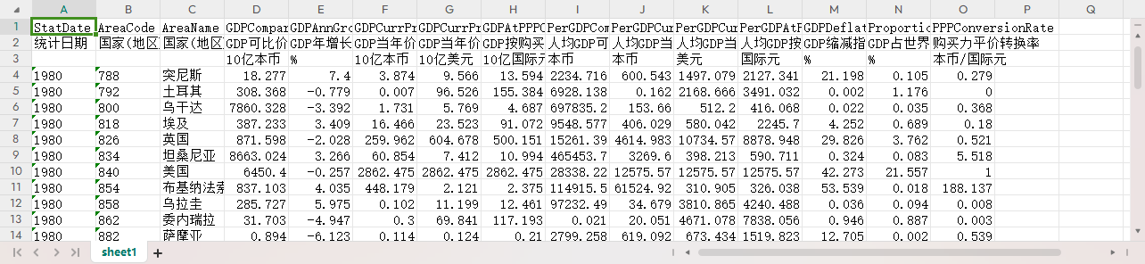 统计日期 国家(地区)代码 国家(地区)名称 GDP可比价格 GDP年增长率-可比价格 GDP当年价格-本币 GDP当年价格-美元 GDP按购买力平价计算-当年价格 人均GDP可比价格 人均GDP当年价格-本币 人均GDP当年价格-美元 人均GDP按购买力平价计算-当年价格 GDP缩减指数 GDP占世界总值的比例 购买力平价转换率
