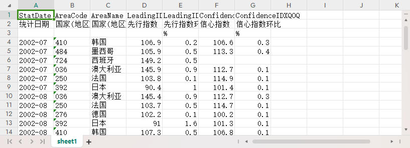 统计日期 国家(地区)代码 国家(地区)名称 先行指数 先行指数环比 信心指数 信心指数环比